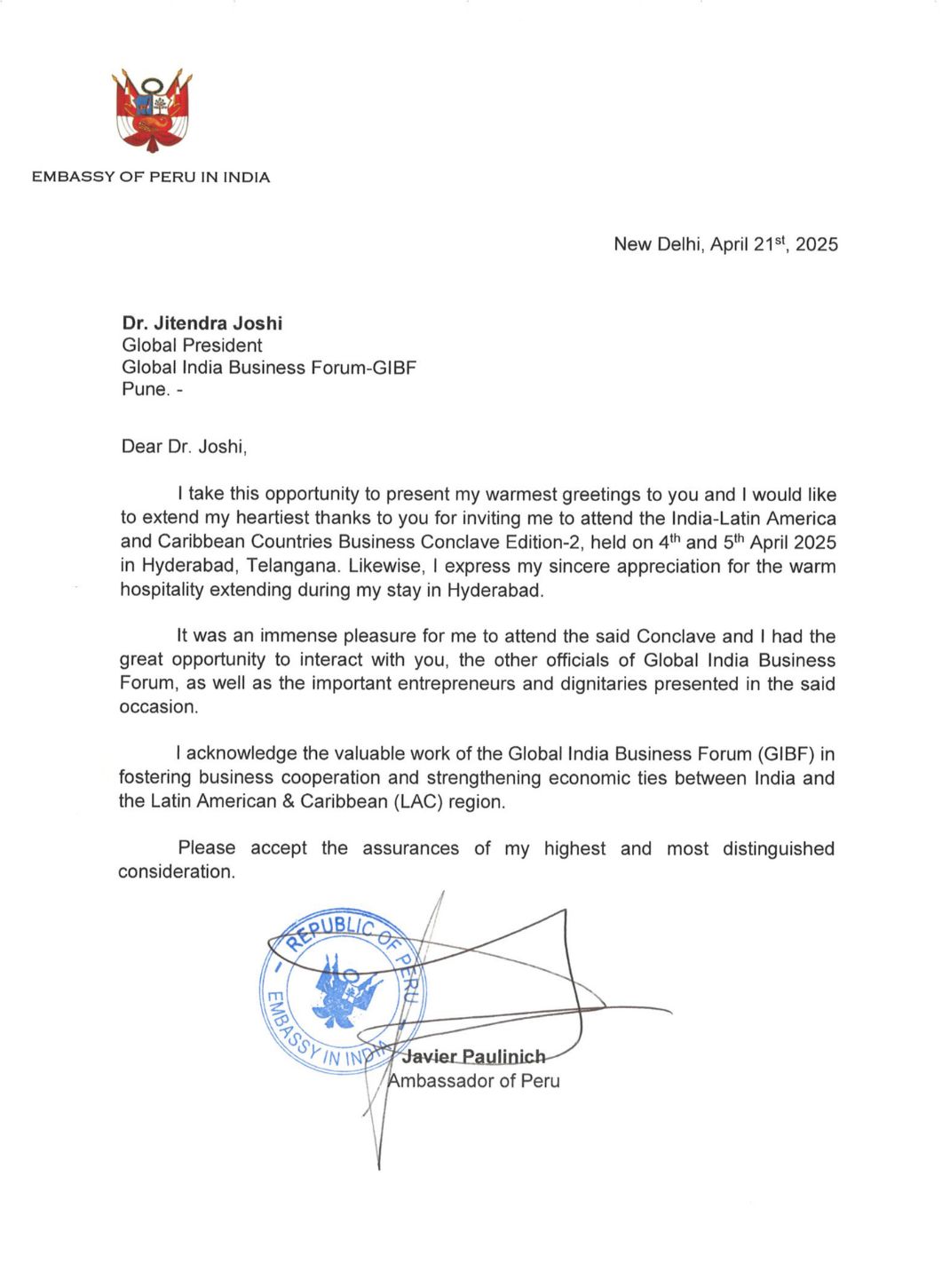 The Embassy of the Republic of Peru in India